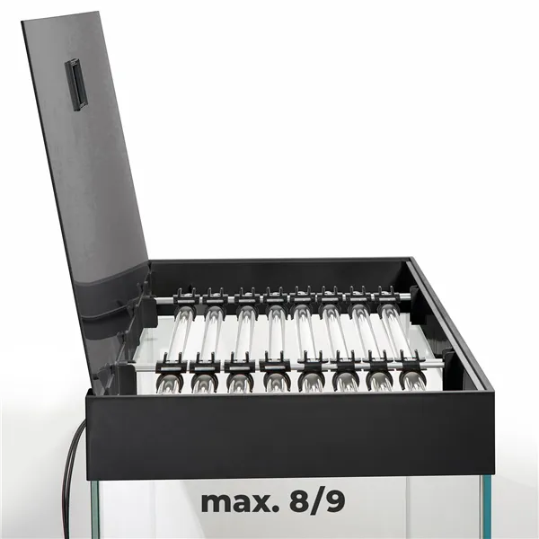 • Víko akvária je dokonale sladěno s rámem a vybaveno patentovaným systémem Smart Open, díky němuž jej snadno otevřete a zastavíte v libovolné poloze. Praktické uzamykatelné okénko slouží pro pohodlné krmení ryb. Zadní stěna akvária je navíc opatřena technickými otvory pro hadice vnějších filtrů a kabely k elektrozařízení, takže vše působí čistě a přehledně.