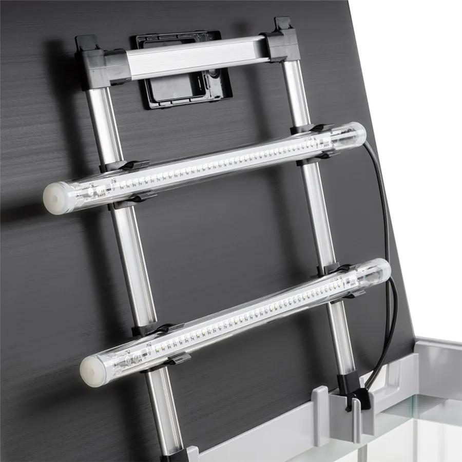 • Pod krytem akvária se nacházejí dvě kolejnice, na které se umisťují LED moduly Aquael Leddy Tube Sunny Day & Night 2.0 10 W . Díky posuvným lištám můžete snadno měnit jejich polohu a rovnoměrně osvětlit celé akvárium, nebo naopak zvýraznit jen vybranou část.