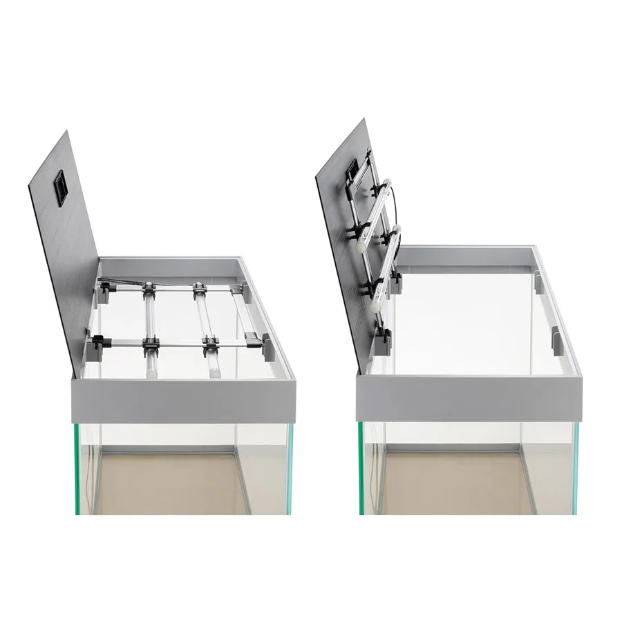 • Víko akvária je dokonale sladěno s rámem a vybaveno patentovaným systémem Smart Open, díky němuž jej snadno otevřete a zastavíte v libovolné poloze. Praktické uzamykatelné okénko slouží pro pohodlné krmení ryb. Zadní stěna akvária je navíc opatřena technickými otvory pro hadice vnějších filtrů a kabely k elektrozařízení, takže vše působí čistě a přehledně.
