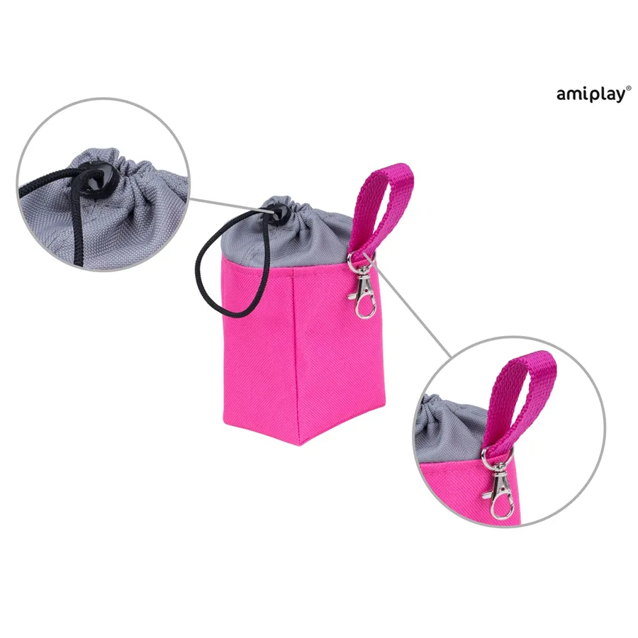 Taška má poutko s karabinou, takže ji můžete připevnit přímo ke kalhotám nebo provléknout opaskem. Chcete-li zabránit vysypání pamlsků nebo ochránit obsah před deštěm, jednoduše sáček uzavřete stahovací šňůrkou.