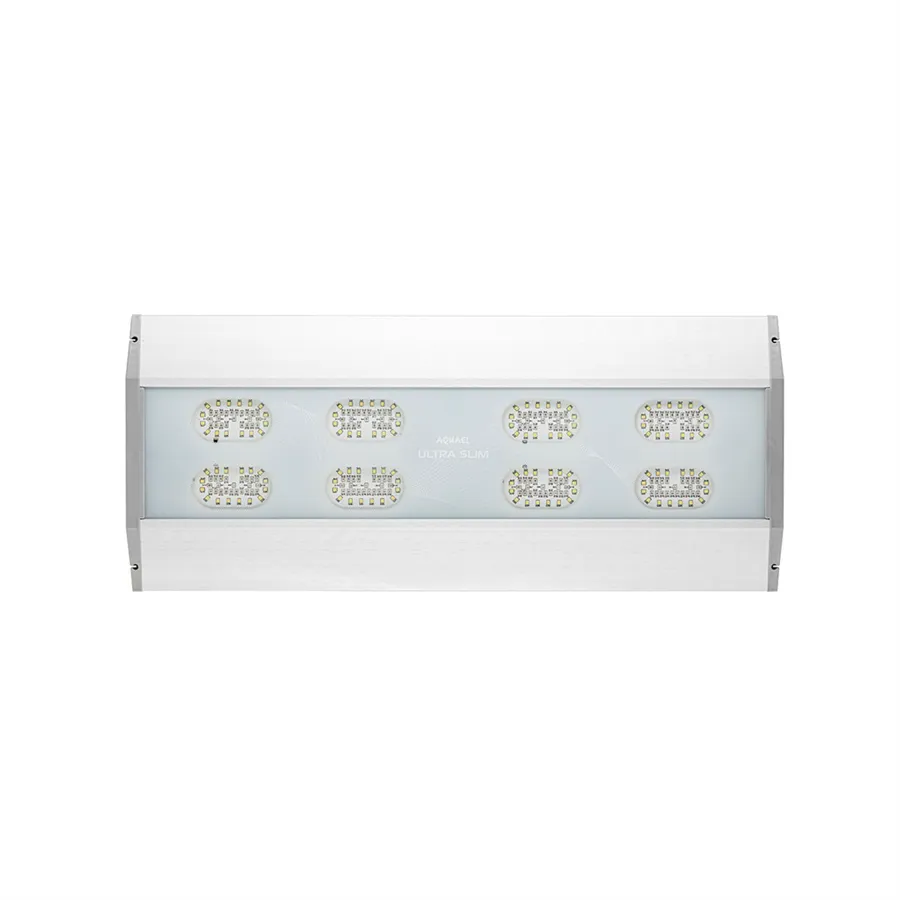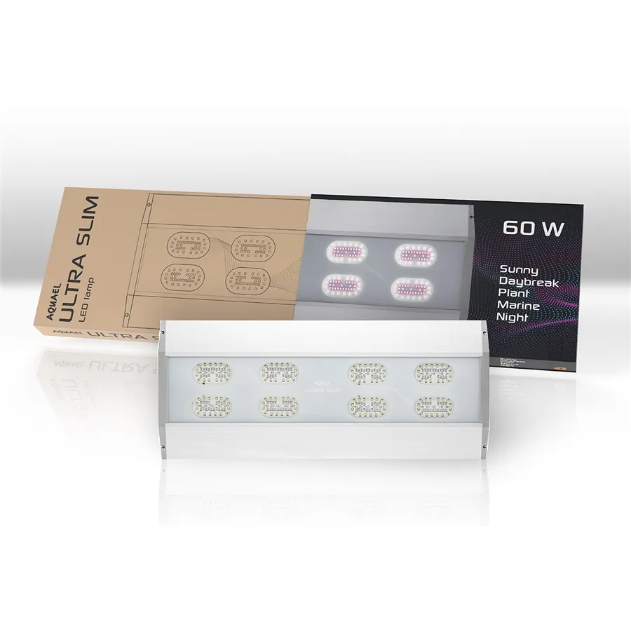 Ideální pro náročná holandská akvária s rozmanitou vegetací, UltraSlim se snadno přizpůsobí rozměrům vašeho akvária. Pokud máte akvárium nestandardních rozměrů, pak by vás UltraSlim měl zaujmout o to více. Vybírat můžete ze 3 velikostních variant lampy s délkami: 30, 60 a 90 cm nebo si můžete vytvořit samostatný osvětlovací modul zavěšením lamp vedle sebe. UltraSlim má také 2 možnosti montáže: můžete ji zavěsit nad akvárium na ocelová lanka nebo ji připevnit k okrajům nádrže pomocí nastavitelného rámu vybaveného průhlednými vodítky. Úspora energie a bezpečnost V závislosti na velikosti má UltraSlim 4, 8 a 12 reflektorů, z nichž každý je vybaven 38 moderními LED diodami s vysokou účinností >103 lm/W. Diody vyzařují mnohem více světla než tradiční zářivky, přičemž spotřebovávají přibližně o 50 % méně elektrické energie. Faktorem, který dále přispívá k energetické účinnosti, stejně jako k bezporuchovému a tichému provozu svítidla, je použitý pasivní systém chlazení. Díky jeho konstrukci zářivka účinně odvádí přebytečné teplo a nepotřebuje další zdroje chlazení, jako jsou ventilátory. Stejně jako ostatní výrobky Aquael zaručuje UltraSlim vysoký standard bezpečnosti při používání. Lampa je napájena bezpečným provozním napětím 24 V, které nepředstavuje žádné nebezpečí pro lidský život a zdraví. UltraSlim zůstane v bezpečí i v případě krátkého ponoření do vody, což zaručuje vodotěsnost IPX7. Design svítidla Aquarist UltraSlim kromě vysokého světelného výkonu jistě upoutá pozornost svým moderním, minimalistickým designem. Pouzdro je vyrobeno z jediné desky z broušeného hliníku a má tloušťku pouhých 17 mm, díky čemuž je svítidlo opticky mimořádně lehké. Namontována nad nádrží vypadá UltraSlim, jako by nad ní levitovala, což dále zaměřuje pozornost pozorovatelů na uspořádání akvária. Dostupné světelné režimy kromě funkcí souvisejících výhradně s údržbou nádrže umožňují také vytvořit v místnosti požadovanou náladu. V souladu s přírodními rytmy Lampa UltraSlim je dalším výrobkem společnosti Aquael, který je navržen tak, aby pomáhal co nejlépe reprodukovat v prostředí akvária přirozené podmínky života. Díky režimům SUNNY DAY-BREAK a NIGHT je možné v akváriu obnovit téměř přirozený denní cyklus, který je důležitý pro správné fungování a vývoj živých organismů.