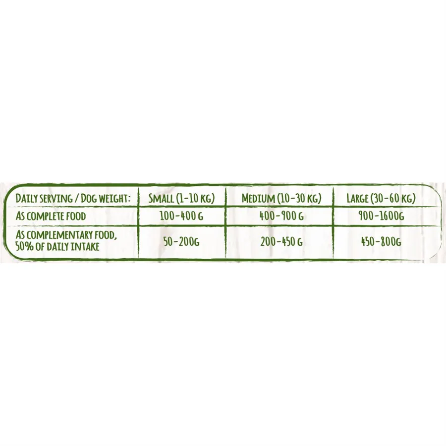 Složení:66% kachna, 14% vývar, 8% proso, 4,3% mrkev, 2% jablka, 2% minerály, 1% mix bylin (rozmarýn, tymián, měsíček, pampeliška), 1% lososový olej, 1% petržel, 0,5% lněné semínko, 0,2% řasy a černý rybíz.