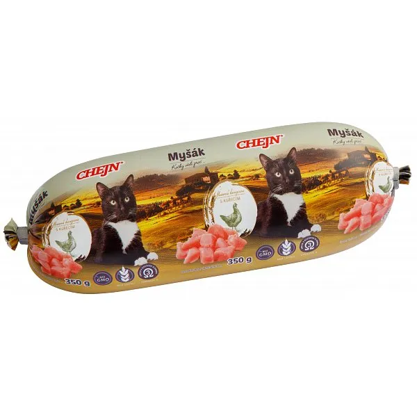 Chejn Myšák s kuřecím 350 gMasová konzerva - kompletní krmivo s kuřecím masemJe vhodný jako kompletní krmná dávka pro kočky všech plemen (viz doporučené dávkování), nebo jako odměna či zpestření granu...
