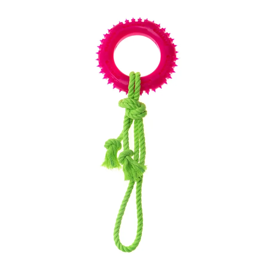 Přetahovací i aportovací růžový Robbi kroužek na barevném laně.