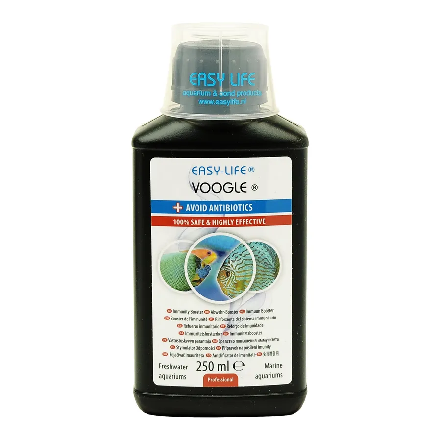 Easy-Life Voogle je inovativní a bezpečný přípravek, který podporuje přirozený imunitní systém ryb a napomáhá jejich hojení – bez použití antibiotik. Díky složení na bázi rostlinných extraktů, vitamínů a minerálů posiluje obranyschopnost, zlepšuje kondici a pomáhá rybám zvládat stresové situace, přepravu nebo karanténu. Je šetrný ke všem obyvatelům akvária, rostlinám i biofiltru a nemění parametry vody.