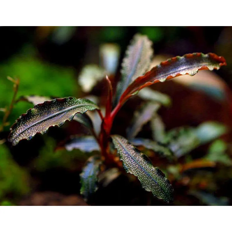 Bucephalandra s podlouhlými červenými stonky a tmavými listy